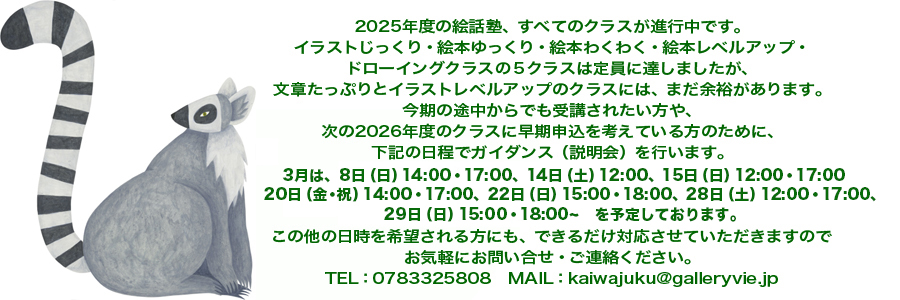 - 2025年度の絵話塾は全てのコースが始まっています。定員に余裕がある「文章たっぷりコース」と「イラストレベルアップコース」を途中からの受講を検討しておられる方や、来期のクラスに早期申込を考えている方のために、下記の日程でガイダンス(説明会)を行います。