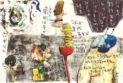 2004年に始まった「モヤンモヤン展」から、今年は連続22回の開催になります。 毎回、創造主・こしあんさんの生みだした、ユニークなキャラクターが活躍する世界が大好評のこの作品展は、「見た人がモヤンモヤンする」 のがコンセプト。 今年は “穴ずらし” や “草女(くさじょ)”、“別名ごも太・本名ミッシェモ” などが登場するエピソード(制作あそび)のお披露目が4〜5個あるそう。でも、それらはいずれまじわりひとつの結末に導かれていくとか… |