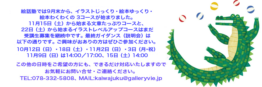11月から始まる絵話塾「文章たっぷりコース」と「イラストレベルアップコース」の受講を検討しておられる方のためにガイダンス(説明会)を行います。