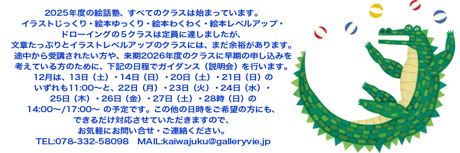 ※絵話塾全般に関するお問い合わせや・ガイダンスに参加ご希望の方はTEL0783325808か、