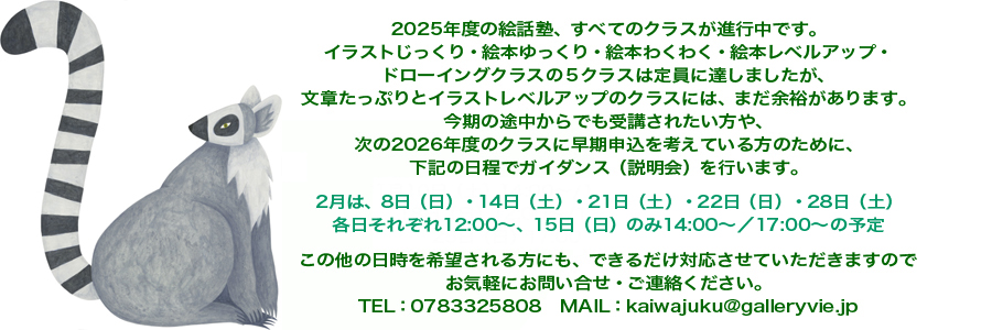 2025年度の絵話塾は全てのコースが始まっています。定員に余裕がある「文章たっぷりコース」と「イラストレベルアップコース」を途中からの受講を検討しておられる方や、来期のクラスに早期申込を考えている方のために、下記の日程でガイダンス(説明会)を行います。